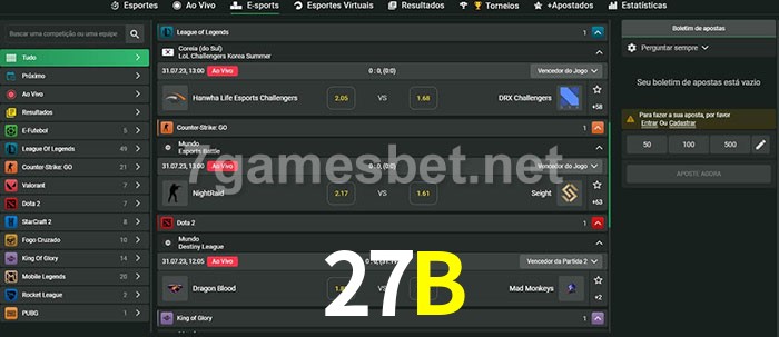 O 27B oferece uma grande seleção de opções de apostas em e-sports com probabilidades competitivas
